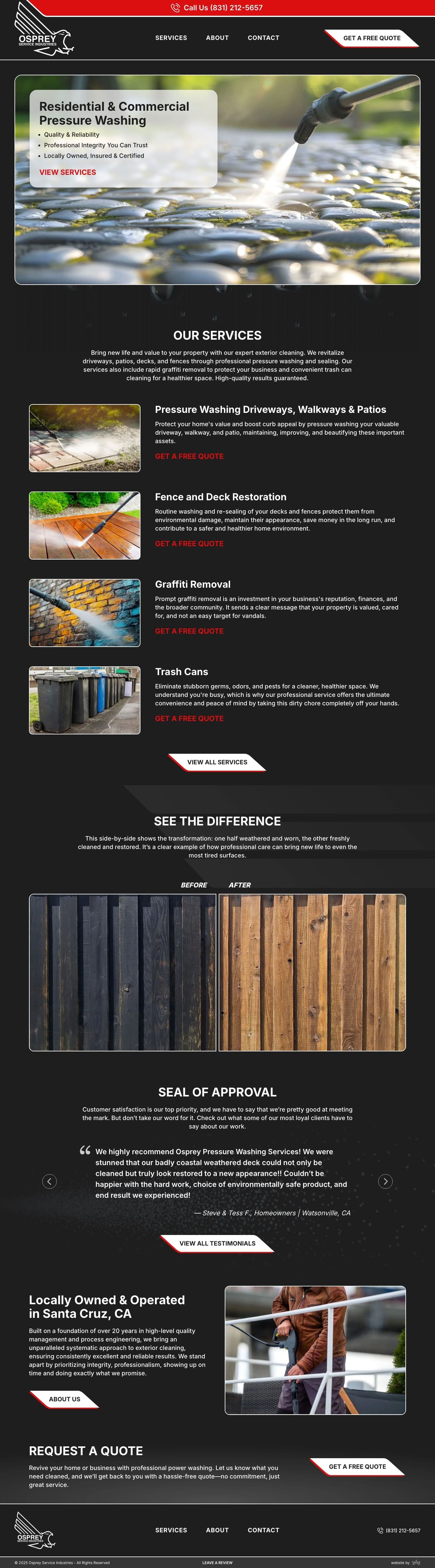 Osprey Service Industries is a newly established, locally owned pressure washing company focused on delivering high-quality exterior cleaning services across Santa Cruz and Monterey County. As a new business, they needed a professional website to introduce their services, showcase before-and-after images, display customer testimonials, and provide a clear path for potential clients to get in touch or request a quote.