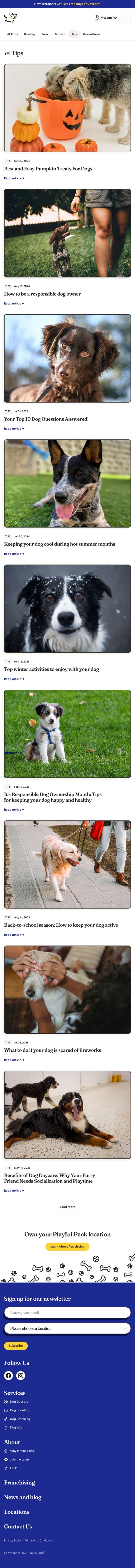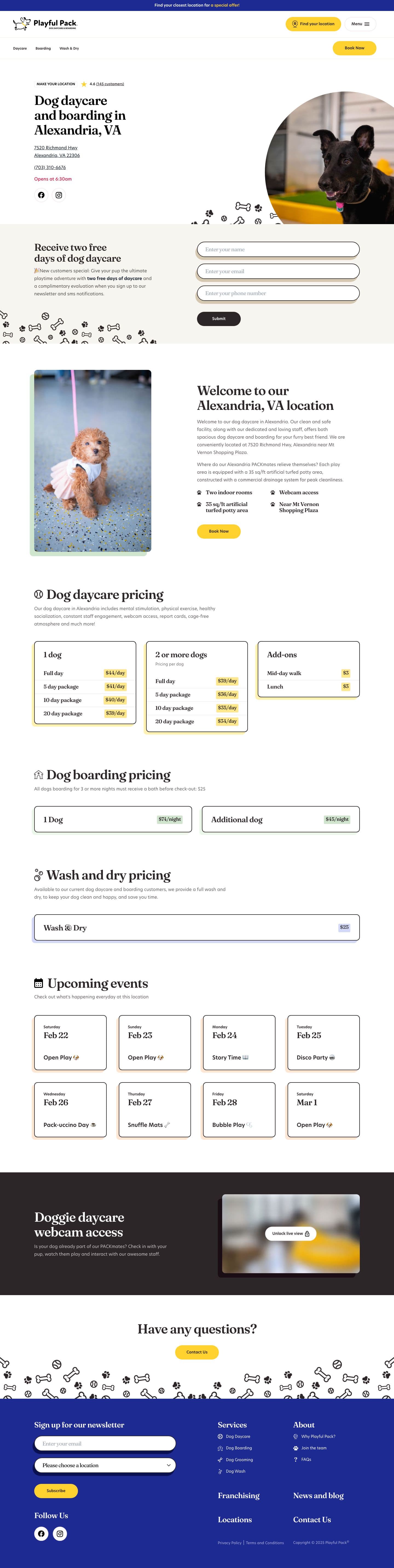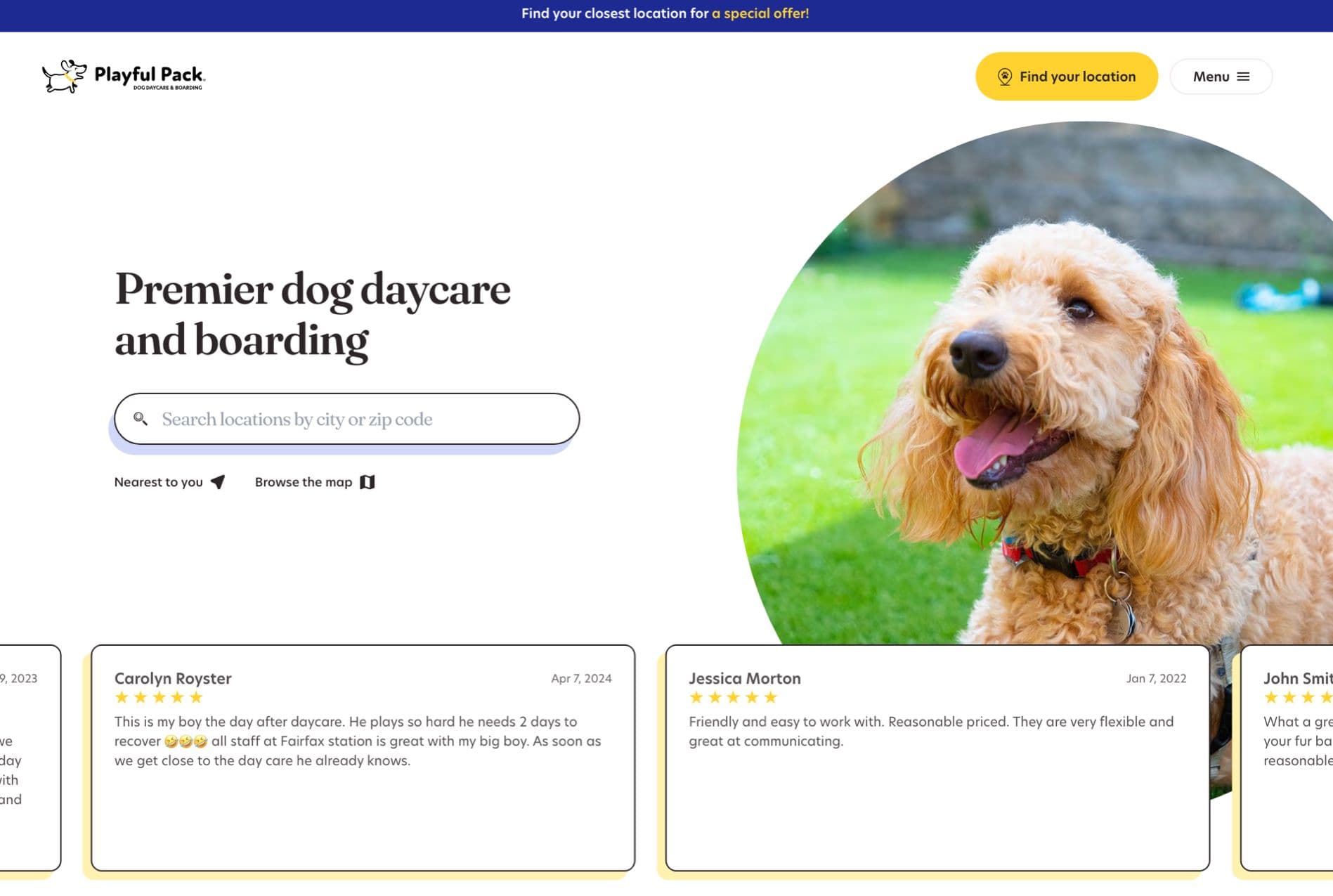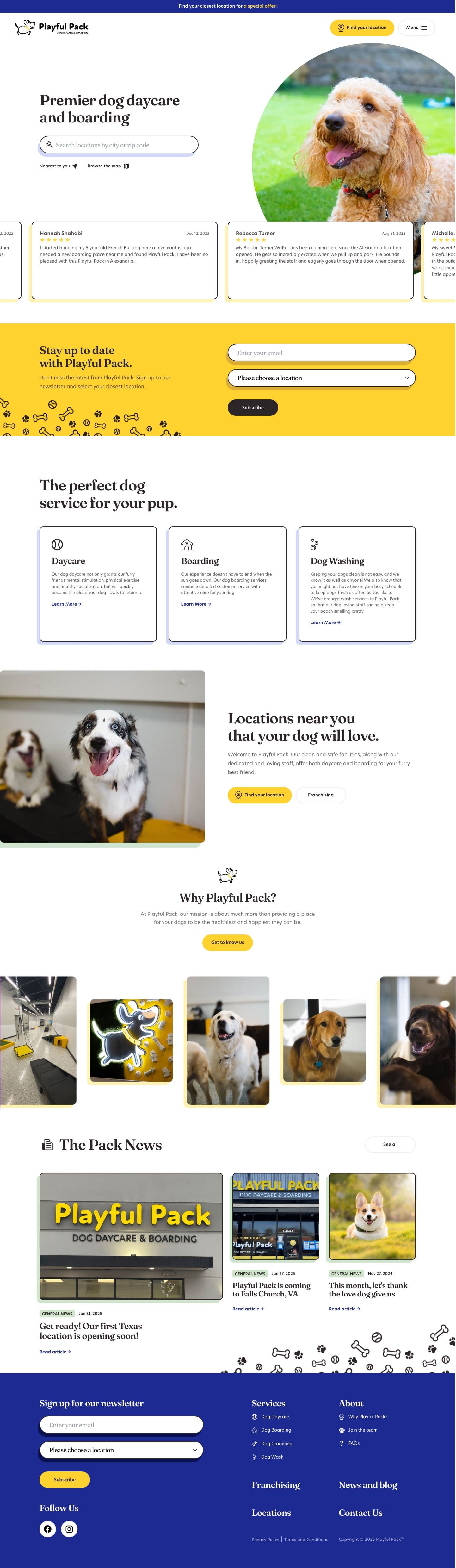 Playful Pack is a growing franchise of dog daycare and boarding facilities with multiple locations within the U.S. They needed a modern, user-friendly website to provide key business information, help users find the nearest location, showcase services with pricing, highlight blog articles, and offer an easy way to get in touch.
