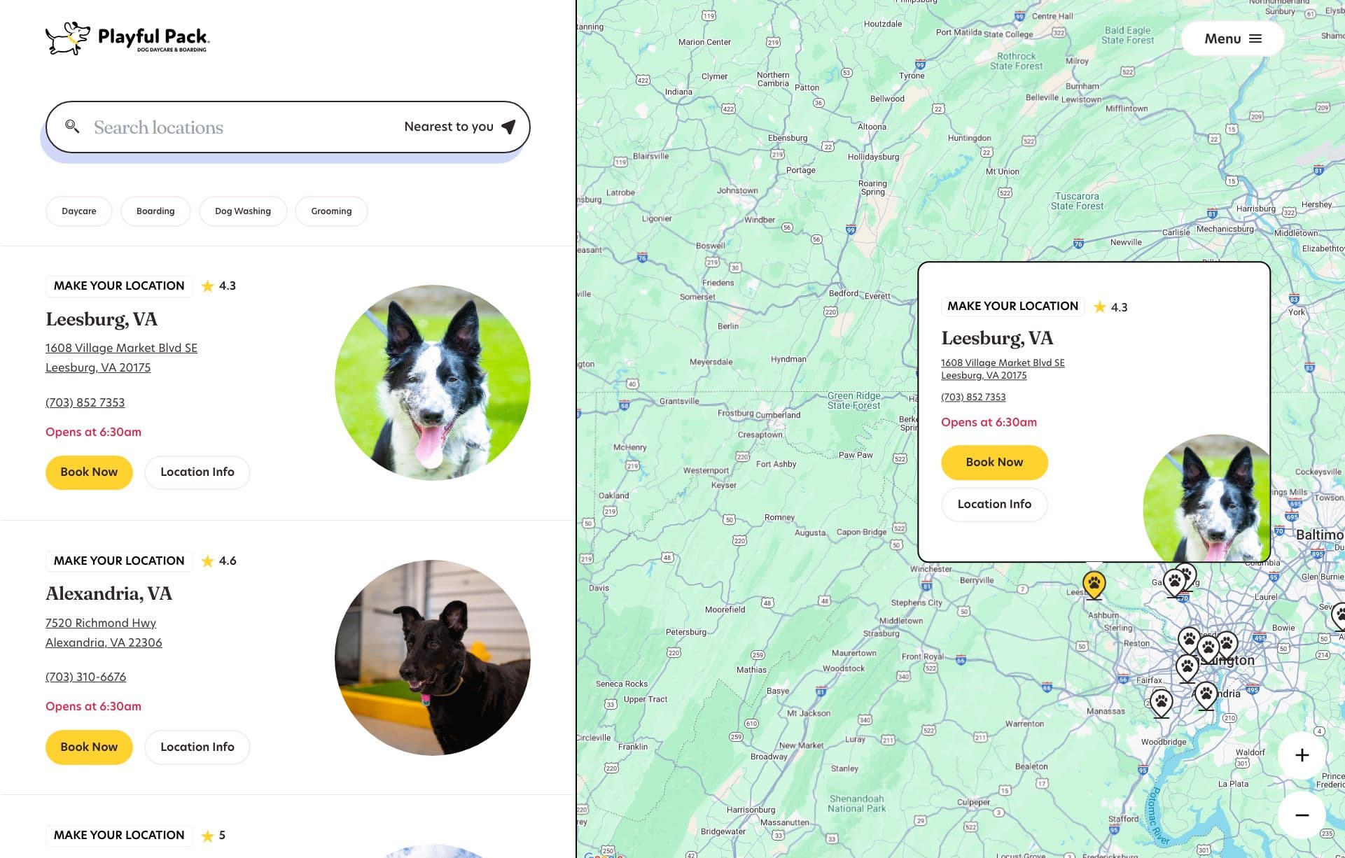 For an even more personalized experience, users can set a preferred location, unlocking location-specific specials and making future bookings a breeze. With quick-access options to view location details or book services on the spot, this system ensures every pet parent finds the right Playful Pack—without the hassle. Built with precision, speed, and a little extra nose work, this map experience is the ultimate way to track down the best spot for your pup.